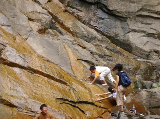 進(jìn)入景區(qū),迎面就是景區(qū)管理站天泉山莊,山莊往前走就是一片原生態(tài)的天然美景,幽谷峰秀,天青水白,怪石流水。大家三五成群的結(jié)伴在山谷里前行,就像是行走在畫里一樣。道路兩旁是溪水和灌木,孩子們時(shí)不時(shí)蹲下用手去撩撥水里的小魚,大人們則一邊欣賞山色美景,一邊為孩子們照相留影。人們就這樣行走在湖光山色之間,大家一路游覽了古廟、仙人石、瀑布水潭等景觀。時(shí)間不知不覺的在人們愉快的交談和孩子們的嬉戲打鬧中過去了。臨近午后,大家三五成群的回到天泉山莊,并在那里午飯休息。男士吃飯喝酒氣氛熱烈,女士嘮家常、品服飾悠閑愜意。孩子們玩耍嬉戲樂而忘返。