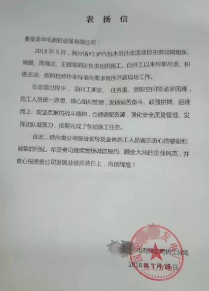 2018年5月18日,公司再次收到來自國電某發(fā)電廠的一封表揚信。信中,甲方對公司全體施工人員盡職盡責、積極主動、規(guī)范有序的態(tài)度和精神提出嘉許。信中提到:“在改造過程中,面對工期緊、任務重、受限空間等諸多因素,施工人員統(tǒng)一思想、精心組織管理,發(fā)揚艱苦奮斗、頑強拼搏、迎難而上、攻堅克難的戰(zhàn)斗精神,合理調(diào)配資源,強化安全質(zhì)量管理、發(fā)揮團隊凝聚力,按期完成了各項施工任務?!?/FONT>