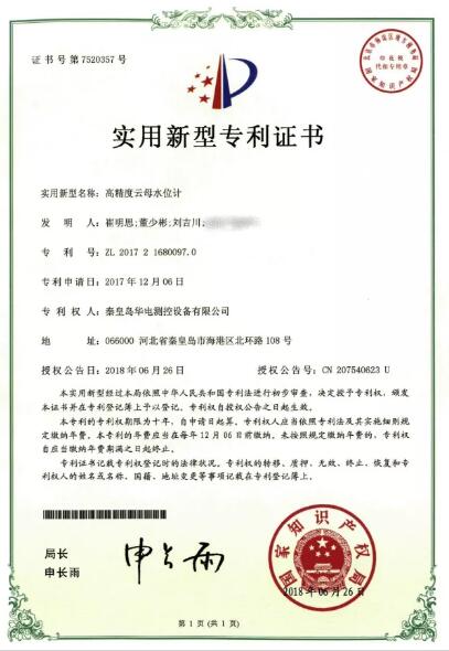 公司于2017年12月6日提交的“高精度云母水位計(jì)”(專利號(hào):ZL 201721680097.0)專利已被中華人民共和國(guó)國(guó)家知識(shí)產(chǎn)權(quán)局頒發(fā)專利證書,授權(quán)公告日為2018年6月26日,授權(quán)公告號(hào):CN 207540623 U。
