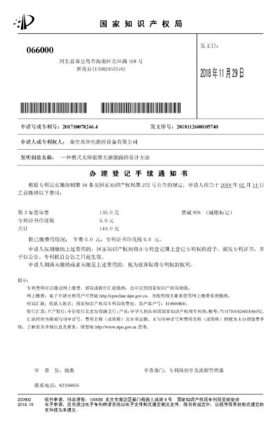 公司于2017年2月14日提交的“一種槽式太陽能聚光器鏡面的設(shè)計(jì)方法”(專利號(hào):201710078246.4)專利已被中華人民共和國(guó)國(guó)家知識(shí)產(chǎn)權(quán)局授予發(fā)明專利權(quán)。此項(xiàng)專利的授權(quán),標(biāo)志著公司已經(jīng)擁有43項(xiàng)自主知識(shí)產(chǎn)權(quán)。