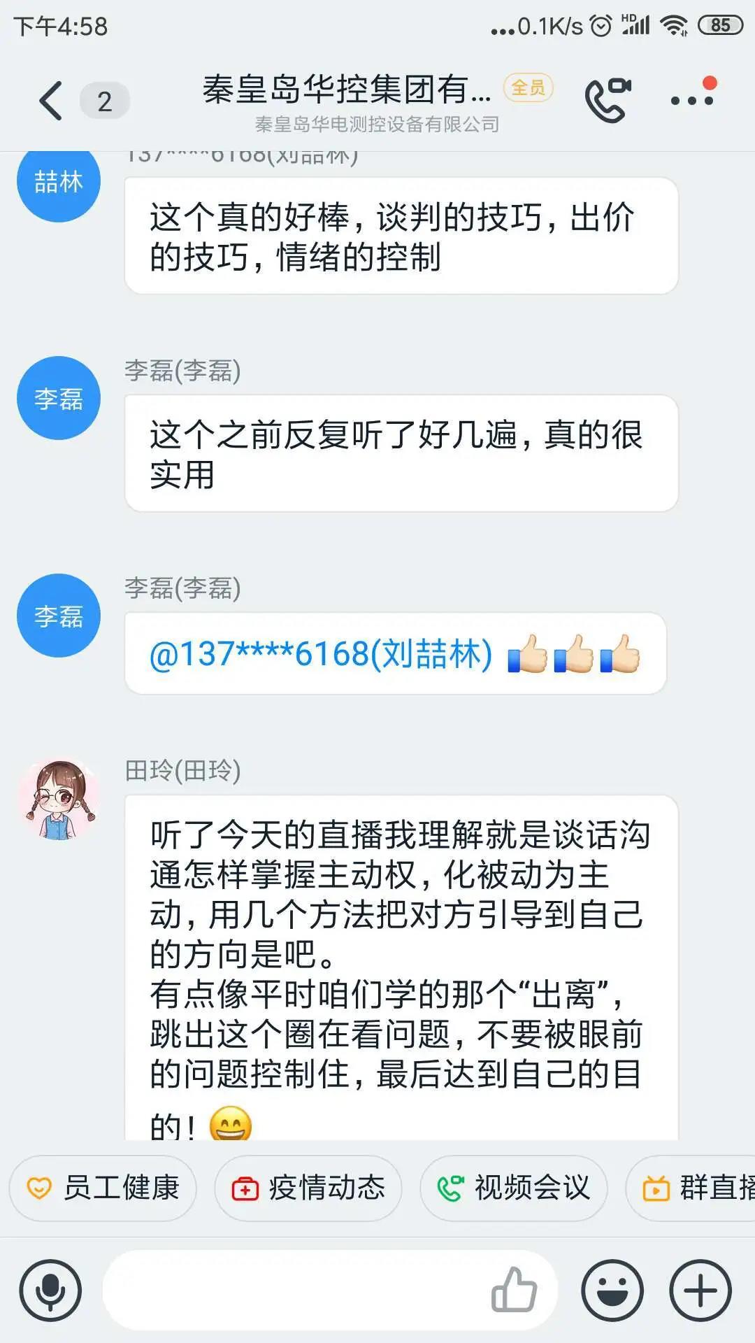 線上充電,勤修內功,防疫不忘學習。線上培訓課程豐富,體驗感強,有收獲,有提升,線上沒聽懂的還可以觀看“直播回放”反復學習,溫故而知新,成效明顯。在人力資源部的引領下,大家線上積極交流培訓感悟。