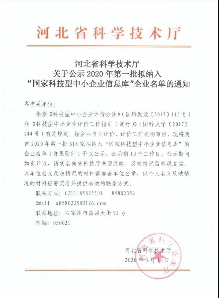 近日,河北省科技廳根據(jù)《科技型中小企業(yè)評(píng)價(jià)辦法》(國(guó)科發(fā)政【2017】115號(hào))、《科技型中小企業(yè)評(píng)價(jià)辦法工作指引(試行)》(國(guó)科火字【2017】144號(hào))要求,公示通過河北省2020年第一批“科技型中小企業(yè)”名單。我公司憑借在企業(yè)科技創(chuàng)新領(lǐng)域的成就成功入選,入庫(kù)登記編號(hào):202013030209000247。