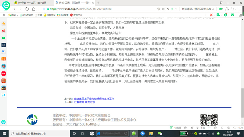 春節(jié)前夕,突如其來的疫情影響了整個中國,在這場戰(zhàn)“疫”面前,人人有責(zé),華控集團作為一家負(fù)責(zé)任、有擔(dān)當(dāng)?shù)拿駹I企業(yè),積極貢獻(xiàn)了自己的力量!關(guān)于華控集團《戰(zhàn)“疫”為國,保民安康》的通訊報道在中國機電一體化技術(shù)應(yīng)用協(xié)會工程技術(shù)發(fā)展中心網(wǎng)站刊登,對我公司在此次戰(zhàn)役做的貢獻(xiàn)進(jìn)行了肯定。大災(zāi)面前,應(yīng)有大愛,這場戰(zhàn)役面前,人人有責(zé)。但要怎么做、如何做,離不開一個積極向上公司正向的引導(dǎo),在這里我想華控集團給我們做了一個很好的榜樣,讓我們知道了什么是責(zé)任、什么是擔(dān)當(dāng)、什么是大愛。