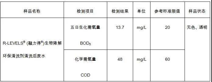 融力得®生物降解環(huán)保清洗劑經(jīng)英格爾檢測(cè)技術(shù)服務(wù)(上海)有限公司檢驗(yàn),生化需氧量為13.7 mg/L,遠(yuǎn)遠(yuǎn)高于中國(guó)國(guó)家環(huán)保標(biāo)準(zhǔn)要求,可以通過(guò)工廠(chǎng)現(xiàn)有污水處理系統(tǒng)進(jìn)行排放。