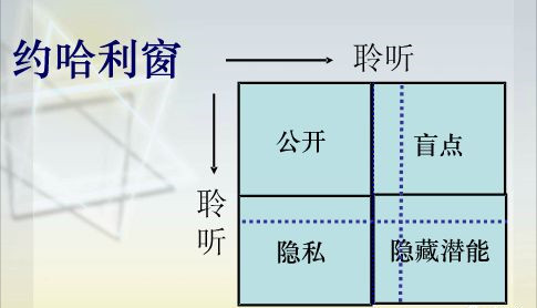 第二點,劉總談到約哈利窗,教練就是將公開區(qū)域擴大,最大限度的提高潛能。