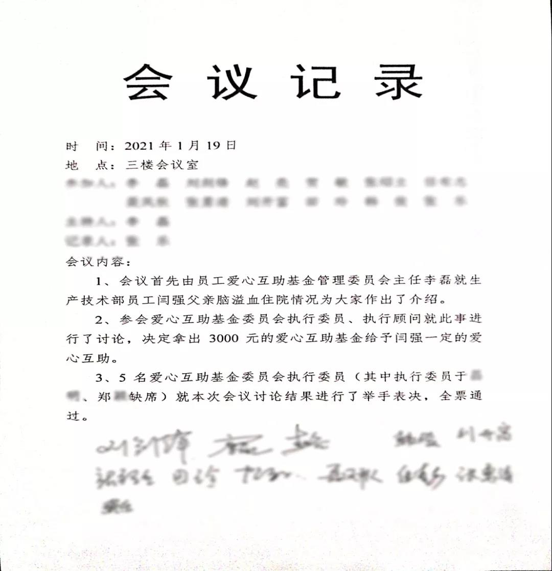1月19日,當(dāng)公司領(lǐng)導(dǎo)得知生產(chǎn)技術(shù)部員工閆強(qiáng)父親因腦溢血而住院的情況后,組織召開了員工愛(ài)心互助基金會(huì)議,會(huì)上經(jīng)過(guò)集體討論,基金決定拿出3000元款項(xiàng)給予一定的愛(ài)心互助。