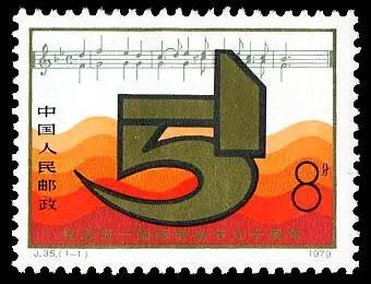 先介紹第一枚郵票,那是中國人民郵政在1979年5月1日發(fā)行的《紀(jì)念“五一”國際勞動節(jié)九十周年》紀(jì)念郵票。該套郵票志號:J.35,全套郵票1枚,面值:8分,票名:鐮刀和鐵錘,設(shè)計者:鄧錫清。