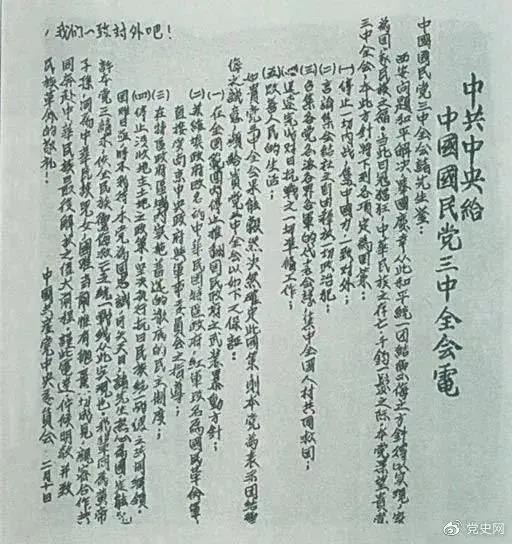 1937年2月10日,中共中央致電國(guó)民黨五屆三中全會(huì),提出五項(xiàng)要求:停止內(nèi)戰(zhàn),一致對(duì)外;保障言論、集會(huì)、結(jié)社的自由,釋放一切政治犯;召開(kāi)各黨各派各界各軍的代表會(huì)議,集中全國(guó)人才,共同救國(guó);迅速完成對(duì)日作戰(zhàn)的一切準(zhǔn)備工作;改善人民生活。電文指出,如果國(guó)民黨將上述五項(xiàng)要求定為國(guó)策,中國(guó)共產(chǎn)黨愿實(shí)行如下四項(xiàng)保證:停止武力推翻國(guó)民黨政府的方針;工農(nóng)政府改名為中華民國(guó)特區(qū)政府,紅軍改名為國(guó)民革命軍;特區(qū)實(shí)行徹底民主制度;停止沒(méi)收地主土地的政策,堅(jiān)決執(zhí)行抗日統(tǒng)一戰(zhàn)線的共同綱領(lǐng)。15日,在國(guó)民黨的五屆三中全會(huì)上,宋慶齡、何香凝、馮玉祥等為響應(yīng)中國(guó)共產(chǎn)黨關(guān)于國(guó)共合作,聯(lián)合抗日的建議,提出關(guān)于恢復(fù)孫中山所制定的聯(lián)俄、聯(lián)共、扶助農(nóng)工三大政策緊急議案。