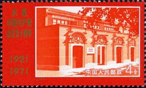 1971年7月1日發(fā)行的編12―20《慶祝中國共產(chǎn)黨成立50周年》紀(jì)念郵票,全套6枚。其中第1枚是“中共一大會址”,由許彥博設(shè)計,影寫版,主圖為“一大會址”外景,畫面邊框采用紅底金字,表示建黨50周年的熱烈吉慶。在構(gòu)圖上突出了掛在自左第一、二扇門之間的石牌,牌上鐫刻著“中國共產(chǎn)黨第一次全國代表大會會址”、“全國重點(diǎn)文物保護(hù)單位”和“中華人民共和國國務(wù)院一九六一年三月四日公布”字樣。 《慶祝中國共產(chǎn)黨成立50周年》郵票首次“不走樣”地展現(xiàn)了中共一大會址的外景,整個票面紅彤彤的,象征著黨從這座石庫門中誕生,一路走來、走向輝煌的歷程。