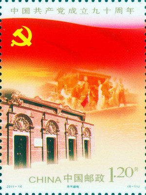 建黨90周年郵票:中國郵政于2011年6月22日發(fā)行《中國共產(chǎn)黨成立九十周年》紀(jì)念郵票1套6枚,小型張1枚。設(shè)計者:郝旭東。面值1.20元。