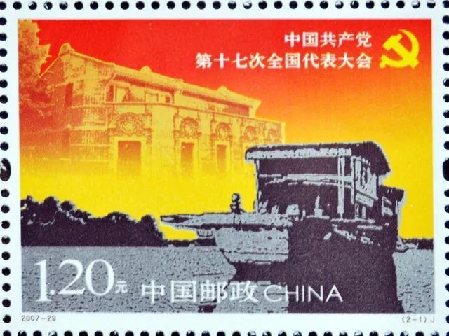 第三次:2007年10月15日,中國共產(chǎn)黨第十七次全國代表大會在北京召開,中國郵政發(fā)行《中國共產(chǎn)黨第十七次全國代表大會》紀(jì)念郵票一套2枚,“南湖紅船”與上海中共“一大”會址,并立設(shè)計在《中共“一大”會議會址》郵票上,這是“南湖紅船”第三次上國家郵票圖,票幅44X33毫米,陳幼林、王戈設(shè)計。
