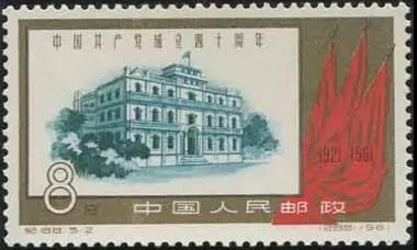 作為“南昌起義”總指揮部的“八一南昌起義大樓”是一座灰色磚混結(jié)構(gòu)建筑,它坐落在南昌中山路和勝利路交叉處的洗馬池,原名“江西大旅社”,現(xiàn)已改建為“八一南昌起義紀(jì)念館”。這座建筑曾多次登上郵票。其中發(fā)行于1961年7月1日的“紀(jì)88 5-2”,即《中國(guó)共產(chǎn)黨成立四十周年》郵票中的第二枚,面值8分,畫(huà)面圖案以金色作邊框,具有鮮明的時(shí)代特征。
