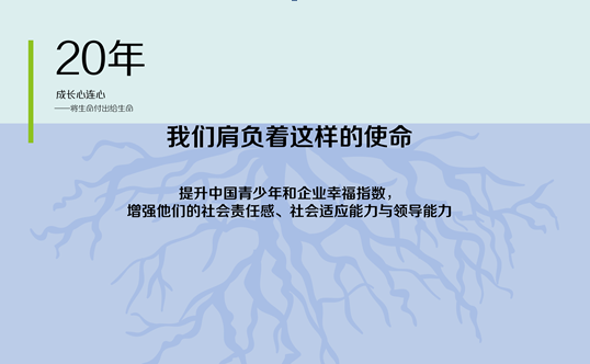 起心動(dòng)念:緣起創(chuàng)始人黃榮華女士早年經(jīng)歷,參考美國(guó)培養(yǎng)下一代的方式,與熱心義工一同創(chuàng)辦“成長(zhǎng)心連心”公益活動(dòng),1995年春天,萌芽于湖南!