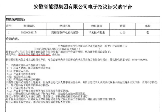 2022年3月18日,安徽某發(fā)電公司“電接點水位計改造項目”招標結果公示,秦皇島華電測控設備有限公司被評選為中標單位。中標產品“高精度取樣電極傳感器”,數量4套,本月底前我公司將完成施工改造。
