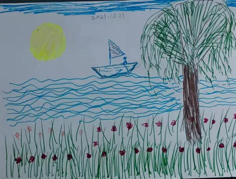 另一幅畫的作者,說自己畫這畫時,心里感覺可幸福了。坐在小船里的人就是自己,正在大海中徜徉。海岸上有很多的花兒開放著,還有一顆大樹。當(dāng)然還有自己的愛人和孩子,藍(lán)藍(lán)的天空,一個大大的太陽。