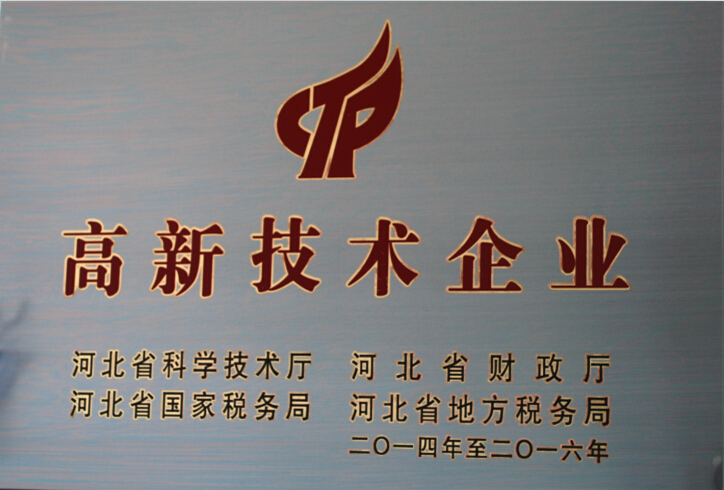 2014年9月19日,公司被河北省科學(xué)技術(shù)廳、河北省財政廳、河北省國家稅務(wù)局、河北省地方稅務(wù)局認(rèn)定為河北省高新技術(shù)企業(yè),證書編號:GR201413000387,近日頒發(fā)了證書和牌匾。