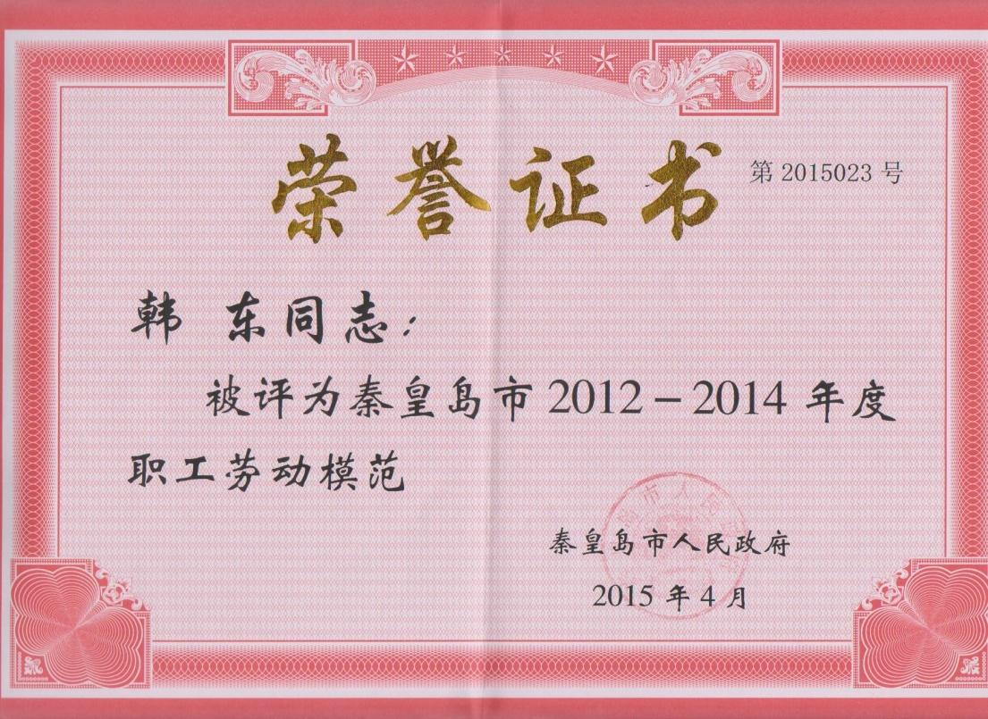 【企業(yè)要聞】熱烈慶祝我公司韓東被評為秦皇島市勞動模范