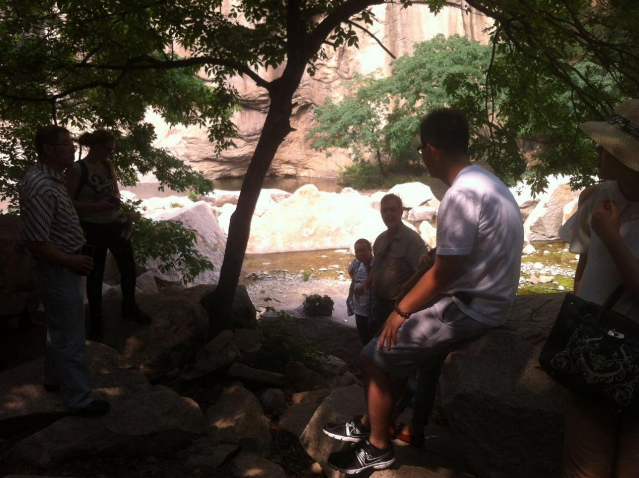 在公司總經(jīng)理劉吉川先生的引領(lǐng)下,邁克、安娜等一行八人攀登了長壽山景區(qū)的九重天山峰,穿越一線天,駐足山巔,登高望遠(yuǎn),邁克和安娜無不為眼前這雄偉壯觀的風(fēng)景所驚嘆。隨后,又依次參觀了懸陽洞、神醫(yī)石窟、壽字碑林等景區(qū),領(lǐng)略其中的歷史文化和人文精神。在山底的一堆巖石中,劉總帶領(lǐng)邁克和安娜見證了“生命的力量”,這是一棵從亂石崗中生長出來的大樹,它為了生存,需要更大的力量去向下生根以獲取水源,向上攀爬以獲取陽光,用自己的生命高度地詮釋了“夾縫中求生存”,這種生命的力量激勵(lì)著劉總用更大的勇氣和信心去建設(shè)華電測控。美國友人邁克感同身受,感慨道:“No pain, no gain.”(譯文:沒有痛苦,就沒有收獲)。安娜則對(duì)中醫(yī)文化情有獨(dú)鐘,劉吉川先生向她講解了刮骨療傷的故事,并借著李時(shí)珍、華佗等神醫(yī)石窟的雕像,概述了中國中醫(yī)文化的歷程。安娜不時(shí)地給雕像和碑文拍照,并把劉總的講解記錄在了她的日記本中,安娜說她回國后馬上就要開始讀醫(yī)學(xué)的研究生,劉總生動(dòng)的講解激發(fā)了她對(duì)醫(yī)學(xué),特別是中醫(yī)學(xué)的興趣,真是起到了拋磚引玉的作用。