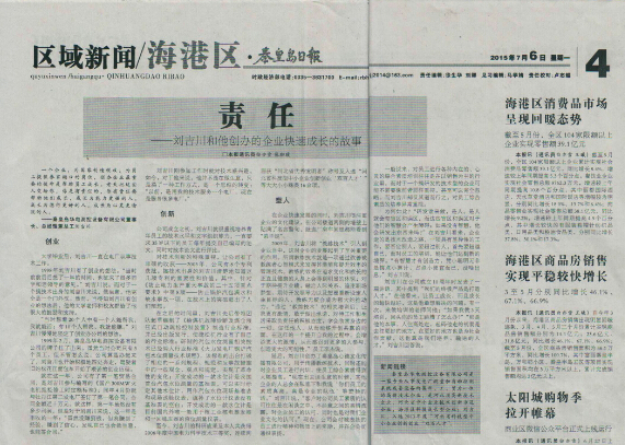 2015年7月6日,秦皇島日報第四版,以《責(zé)任》為題大篇幅報道了秦皇島華電測控設(shè)備有限公司總經(jīng)理劉吉川先生的個人思想和創(chuàng)業(yè)經(jīng)歷。在此之前,劉總也曾多次被《燕趙都市報》、《秦皇島日報》、《秦皇島晚報》等媒體采訪和報道。以下為報道內(nèi)容: