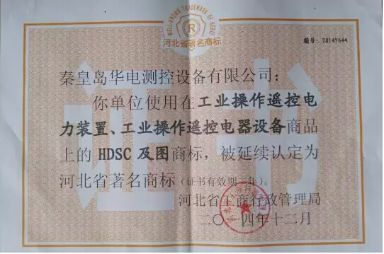 近日,公司收到河北省工商行政管理局頒發(fā)的“河北省著名商標”證書。這是公司使用在工業(yè)操作遙控電力裝置、工業(yè)操作遙控電器設備商品上的HDSC及圖商標,繼2008年首次被認定為“河北省著名商標”后的連續(xù)認定,證書編號為:2014Y644。