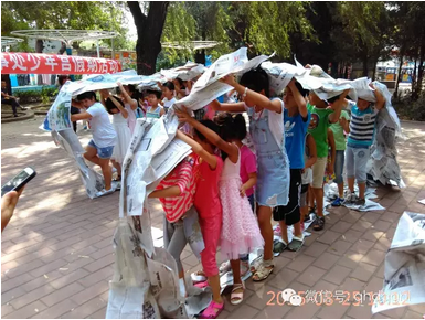 活動在最后一個游戲無敵風火輪中結束,這是一個團結合作的游戲,小朋友分成三組,每組小朋友一起合作,用報紙粘成一個圓圈,使每個小朋友都能在圓圈底下,大家一起頂著圓圈進行比賽,最快完成并達到終點者獲勝,這是一個團結協(xié)作的過程,每個小朋友都要在隊伍中明確自己的位置與責任,做好自己工作的同時也要保證其他小朋友的任務有序順利的進行。