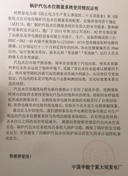 華能寧夏大壩發(fā)電廠的使用情況證明