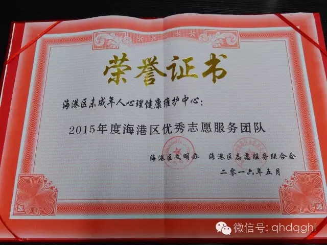 2016年5月26日上午,海港區(qū)區(qū)委區(qū)政府組織召開了海港區(qū)志愿服務(wù)工作推進會。會上對2015年度海港區(qū)優(yōu)秀志愿者及志愿者團隊進行了表彰,海港區(qū)未成年人心理健康維護中心暨秦皇島市市民情感護理中心喜獲2015年度海港區(qū)優(yōu)秀志愿者團隊獎。