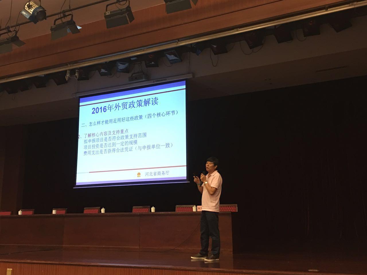 本次主題培訓(xùn)在秦皇島大酒店舉辦。培訓(xùn)的第一課是由省商務(wù)廳外貿(mào)處處長權(quán)奇衡解讀了國務(wù)院《關(guān)于促進(jìn)外貿(mào)回穩(wěn)向好的若干意見》和省政府辦公廳《關(guān)于 2016年全省外貿(mào)攻堅(jiān)行動(dòng)方案的通知》,他詳細(xì)解讀了國務(wù)院和我省為了加快培育外貿(mào)競(jìng)爭(zhēng)新優(yōu)勢(shì)的相關(guān)政策;接下來來自省貿(mào)促會(huì)展覽部的王曉曼部長講解了出國展覽及國際市場(chǎng)開拓,她詳細(xì)地為大家講解了出國展覽的相關(guān)注意事項(xiàng)以及如何利用展覽去開拓國際市場(chǎng);隨后省國稅局進(jìn)出口處副處長王翠蓮為我們解讀了出口退稅相關(guān)政策,介紹了退稅流程和相關(guān)最新退稅手續(xù);省外匯管理局經(jīng)常項(xiàng)目處主任科員于慶榮講解了貨物貿(mào)易外匯管理業(yè)務(wù);秦皇島海關(guān)稽查科科長王素素解讀了海關(guān)企業(yè)信用管理暫行辦法,同時(shí)中信保河北分公司處長助理孫東坡解讀了出口信保的相關(guān)政策;最后阿里巴巴秦皇島負(fù)責(zé)人賈東華為我們講述了“大數(shù)據(jù)讓中國外貿(mào)更美好”的課程,介紹了大數(shù)據(jù)時(shí)代的機(jī)遇與挑戰(zhàn)。