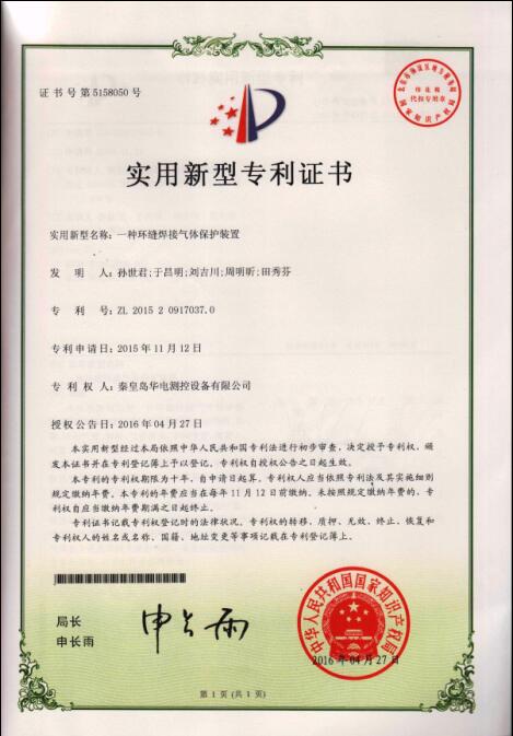 在此項(xiàng)目研發(fā)過程中,由于昌明和孫世君共同研發(fā)的“一種環(huán)縫焊接氣體保護(hù)裝置”已被中華人民共和國國家知識產(chǎn)權(quán)局頒發(fā)實(shí)用新型專利證書。