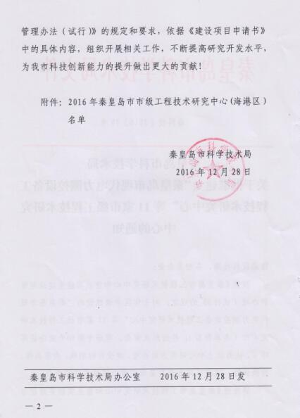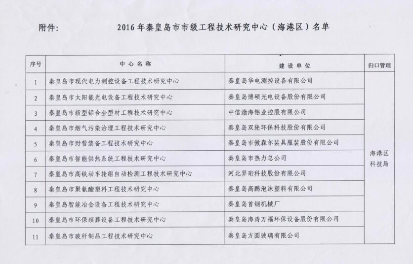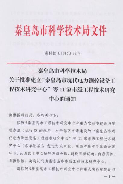 2016年公司申請建設(shè)的“秦皇島現(xiàn)代電力測控設(shè)備工程技術(shù)研究中心”市級工程技術(shù)研究中心,經(jīng)過秦皇島市科學(xué)技術(shù)局組織進(jìn)行的形式審查、現(xiàn)場考察和專家論證等環(huán)節(jié),認(rèn)為中心研究方向合理,建設(shè)目標(biāo)明確,內(nèi)容具體、有操作性,被認(rèn)定為秦皇島市市級工程技術(shù)研究中心。