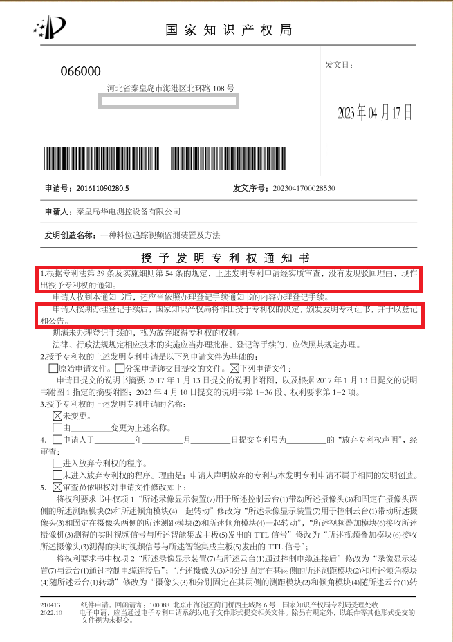 華電測控設(shè)備有限公司又獲一項發(fā)明專利” 2023-04-252023年4月17日,秦皇島華電測控設(shè)備有限公司收到國家知識產(chǎn)權(quán)局發(fā)來的《一種料位追蹤視頻檢測裝置及方法辦理登記手續(xù)通知書》和《一種料位追蹤視頻檢測裝置及方法授予發(fā)明專More