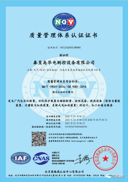 華電測(cè)控順利通過(guò)ISO9001質(zhì)量管理體系再認(rèn)證” 2023-03-072023年3月7日,秦皇島華電測(cè)控設(shè)備有限公司收到來(lái)自北京恩格威認(rèn)證中心頒發(fā)的《質(zhì)量管理體系認(rèn)證證書》,這表明華電測(cè)控2023年ISO9001質(zhì)量管理體系再認(rèn)證順利通過(guò)!秦皇島華電測(cè)More